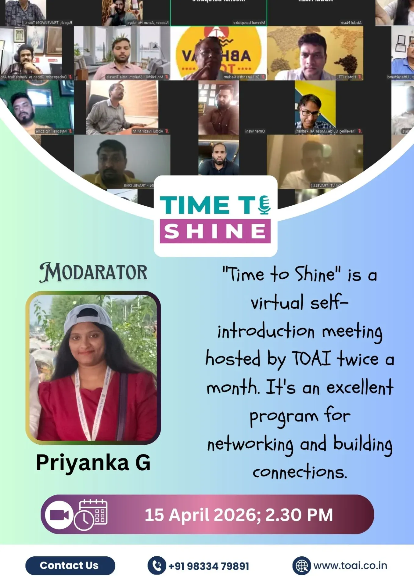 "Time to Shine" is a virtual self-introduction meeting hosted by TOAI twice a month, exclusively for its members. This program serves as a fantastic platform for members to network, share their experiences, and build meaningful connections within the TOAI community.